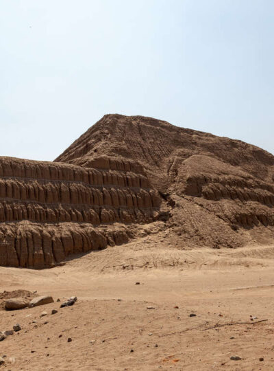 Construite entre les Ier et Ve siècles après J.-C., la Huaca del Sol était un centre politique et administratif majeur de la civilisation Moche. Élevée en briques de terre crue (plus de 140 millions à l’origine), elle mesurait près de 40 mètres de haut et comptait plusieurs plateformes superposées. Bien qu’en partie endommagée par l’érosion et les pillages coloniaux, elle reste l’un des plus grands monuments en adobe d’Amérique préhispanique.