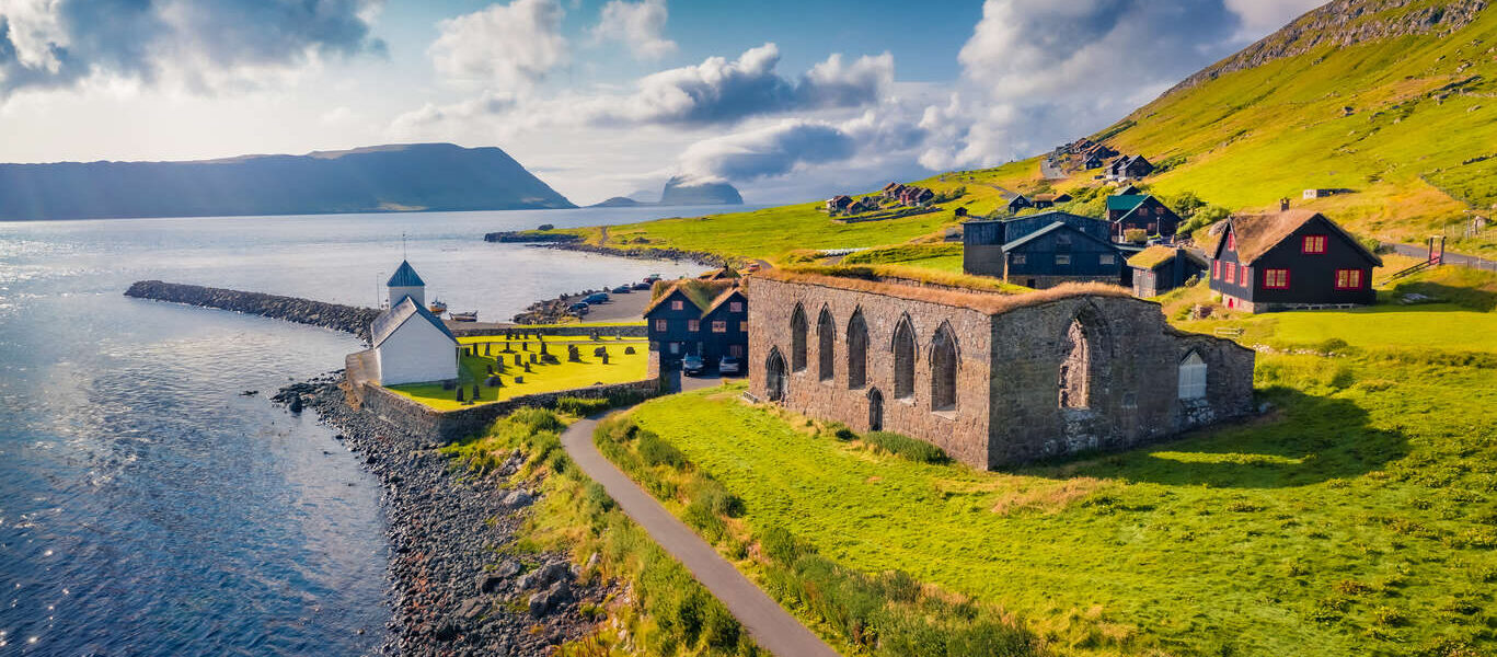 Ce petit village chargé d’histoire abrite trois monuments majeurs : l’église Saint-Olav, toujours en activité depuis le XIIe siècle, les ruines impressionnantes de la cathédrale Magnus, et la ferme Roykstovan, habitée par la même famille depuis 17 générations. Un voyage à Kirkjubøur, c’est avant tout un retour dans le passé, à une époque où ce village était le centre religieux et culturel de l’archipel.