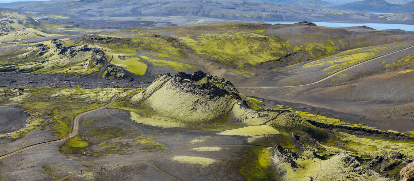 Le Laki, ou Lakagígar en islandais, est une chaîne de plus de 130 cratères alignés, née de l’éruption de 1783. Ce relief spectaculaire, rare à l’échelle du monde, donne l’impression de marcher sur une autre planète.