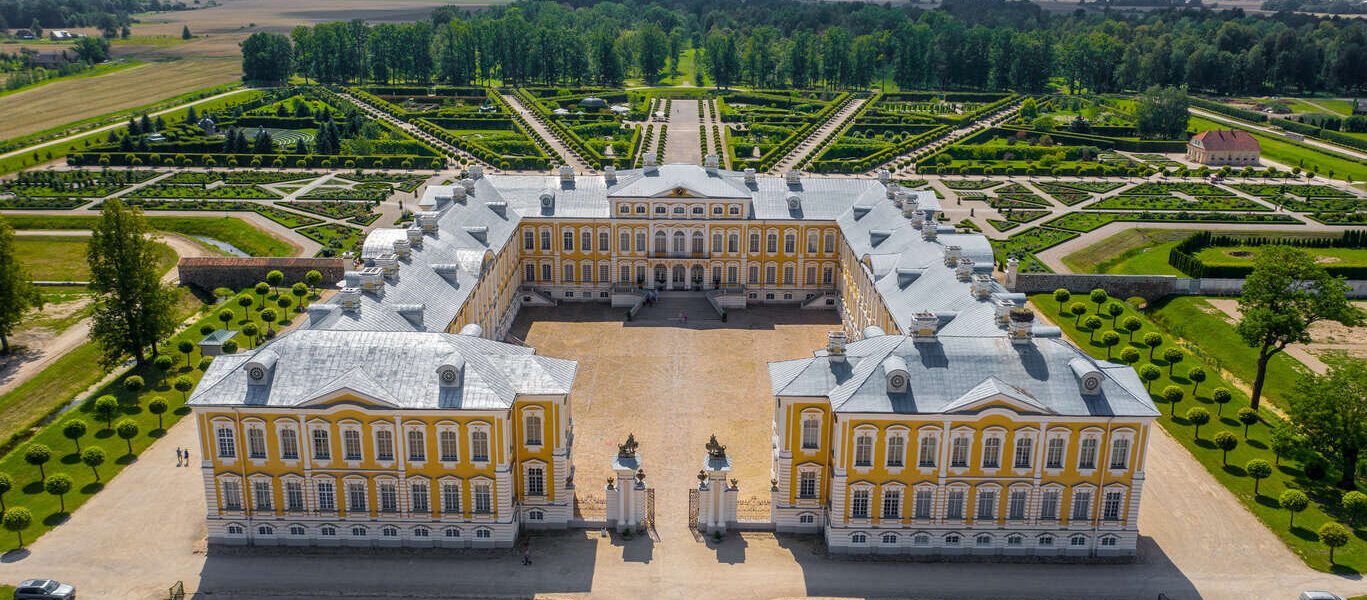 Baigné par une lumière élégante qui souligne la symétrie des façades et la richesse des décors, le palais dévoile des intérieurs somptueux : salons d’apparat, galeries ornées, boiseries délicates et plafonds peints plongent le visiteur dans l’univers raffiné des ducs de Courlande. À l’extérieur, les jardins à la française, dessinés avec une précision remarquable, offrent un écrin de verdure ordonné, ponctué d’allées, de fontaines et de roseraies.