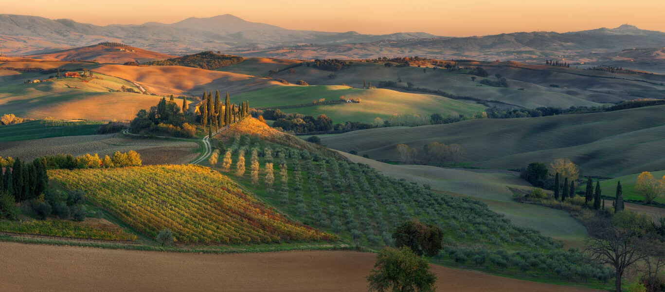 Ici, les cyprès bordent des chemins de terre, les collines douces ondulent sous la lumière dorée, et les champs de blé, de vignes et d’oliviers se succèdent à perte de vue. Des villages comme Pienza, Montalcino ou San Quirico d’Orcia ponctuent le territoire de touches de pierre chaude et de vie locale authentique. Le rythme est lent, propice à la contemplation, au goût et à la flânerie.
