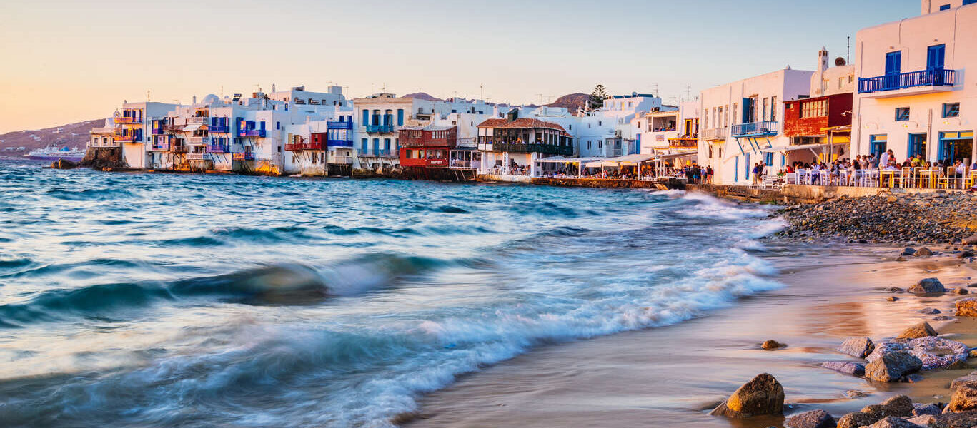 A Mykonos, il y a vraiment l’embarras du choix en matière de plages qui sont nombreuses à répondre indifféremment aux envies de bronzer « paisible », « festif » et/ou « sportif » ; pratiquer les sports de voile (surtout planche à voile et kitesurf) au gré de magnifiques spots paraît indispensable ; s’adonner à la plongée sous-marine ou au snorkeling permet de profiter de fonds marins superbes ; profiter des petits restaurants avec vue sur mer pour se régaler de spécialités locales ; sortir pour faire la fête ressemble à un passage obligé au regard d’une renommée jamais démentie. Bars, restaurants et boîtes de nuit s’y comptent par dizaines ; admirer l’un des plus beaux couchers de soleil sur la mer Égée depuis le quartier surnommé « la Petite Venise » ; parcourir les petites routes de l’île en voiture pour s’assurer de tout voir.