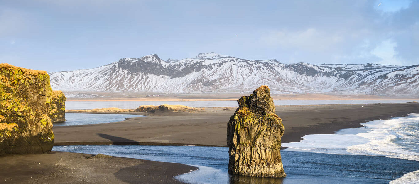 Vous y découvrez l’incroyable plage de Reynisfjara, célèbre pour ses colonnes de basalte et ses vagues puissantes. Les rochers de Reynisdrangar, surgissant de l’océan, ajoutent une touche de mystère à ce décor unique. À proximité, ne manquez pas les cascades de Skógafoss et Seljalandsfoss, accessibles facilement en voiture.
