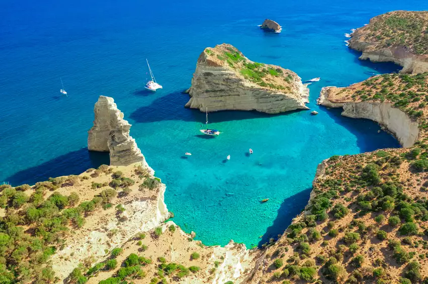 Traversée vers Milos puis transfert vers Adamas. Milos, île volcanique, dévoile des paysages spectaculaires : Sarakiniko, ses falaises blanches lunaires ; Klima, village coloré au bord de l’eau ; Kleftiko, arches et grottes sculptées par la mer.