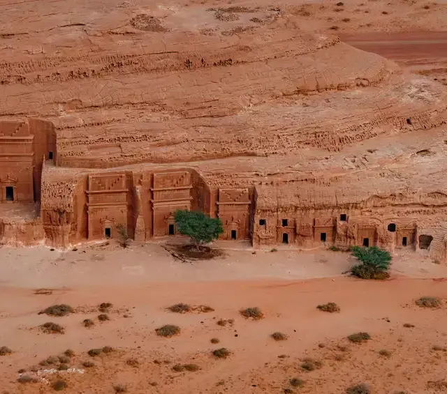 Après un temps de repos dans votre chambre pour récupérer du vol, en début d’après-midi, vous rejoignez le site d’Hégra, premier joyau saoudien classé à l’UNESCO. Votre visite en petit groupe, menée par un rawi local (ou audio-guide à disposition), vous plonge dans le monde des Nabatéens. Devant vous, des façades sculptées dans la roche se dressent, majestueuses, tandis que le sable porte encore la mémoire des caravanes antiques. Vous explorez Qasr Al-Farid, le tombeau isolé, et les sépultures royales creusées dans la falaise.