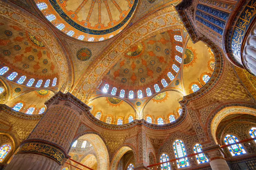 La Mosquée Bleue : Les 21.000 faïences bleues font appeler la Mosquée de Sultanahmet la Mosquée Bleue. Le Sultan Ahmet 1er la fit construire en 1609 par Mehmet Aga, le disciple de l’architecte Sinan. Elle est pourvue d’une élégance particulière avec ses 6 minarets et ses cascades de coupoles, dont la principales fait 43 m de haut et 23,5 m de diamètre.