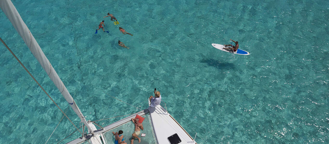 Fin après-midi au mouillage à côté d’un motu pour des loisirs nautiques.
