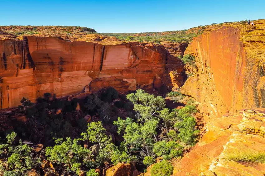 La route vous mène ensuite vers le parc de Watarrka. Kings Canyon impressionne par ses parois de grès de plus de 100 mètres de haut et son « Jardin d’Éden », une oasis de verdure cachée au creux des roches rouges, offrant un contraste saisissant de couleurs et de vie.