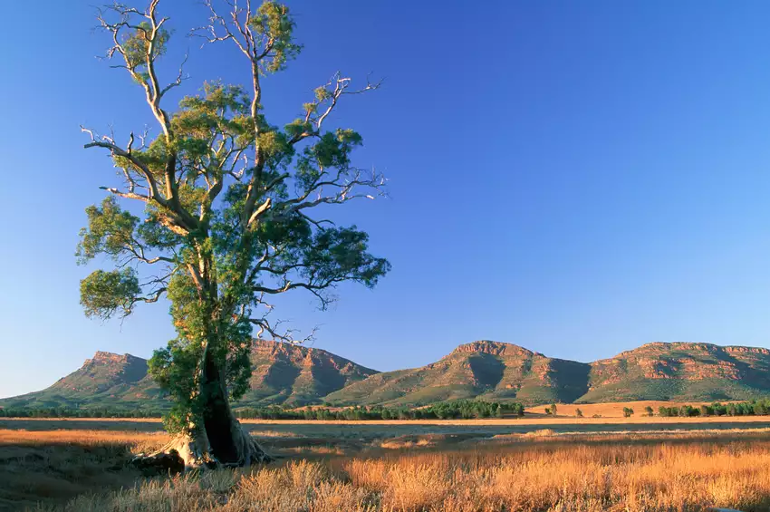 Route vers Wilpena Pound et les Flinders Ranges. Vous quittez la côte pour vous enfoncer dans les terres vers Wilpena Pound. Les routes s’étirent et les paysages deviennent plus spectaculaires à mesure que les crêtes anciennes des Flinders Ranges se dessinent à l’horizon, offrant un premier aperçu de la géologie fascinante du pays.