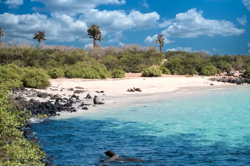 Située au sud-est de Santa Cruz, l’île Santa Fe dévoile une baie aux eaux cristallines, bordée de mangroves et de cactus géants. Depuis le bateau, on aperçoit une longue plage de sable blanc animée par des colonies d’otaries, tandis qu’à l’horizon se dessine une forêt de cactus endémiques, unique à l’île.