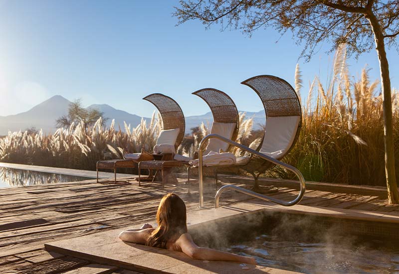 Chaque journée est rythmée par des excursions personnalisées : geysers du Tatio, lagunes turquoise, vallées lunaires, salars et villages andins. De retour au lodge, place à la détente à l’Uma Spa, un sanctuaire de bien-être avec piscine à débordement, jacuzzi et soins inspirés de la nature du désert.