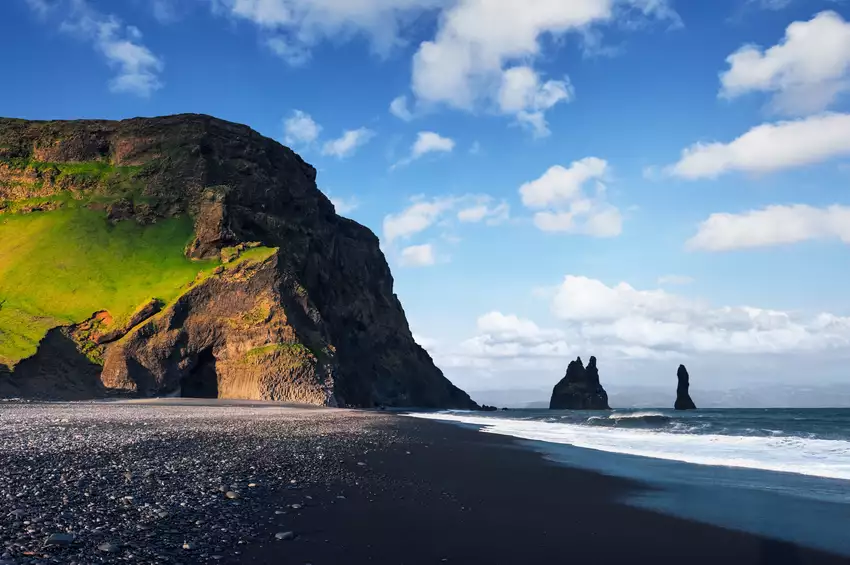 Continuation vers la pointe sud. Découverte de la plage noire de Reynisfjara et ses formations géologiques naturelles : d’immenses colonnes de basalte qui forment une pyramide rocheuse. La légende dit que chaque roche est en fait un troll qui se transforme en pierre lorsqu’il est frappé par la lumière du soleil. Arrêt devant le Dyrhólaey, un immense pilier massif de lave sombre qui s’étend sur 120 mètres dans la mer. Arrivée au village de Vík et petite balade pour s’imprégner de la vie de cette bourgade de moins de 300 habitants ! Dîner et nuit sur la côte sud.