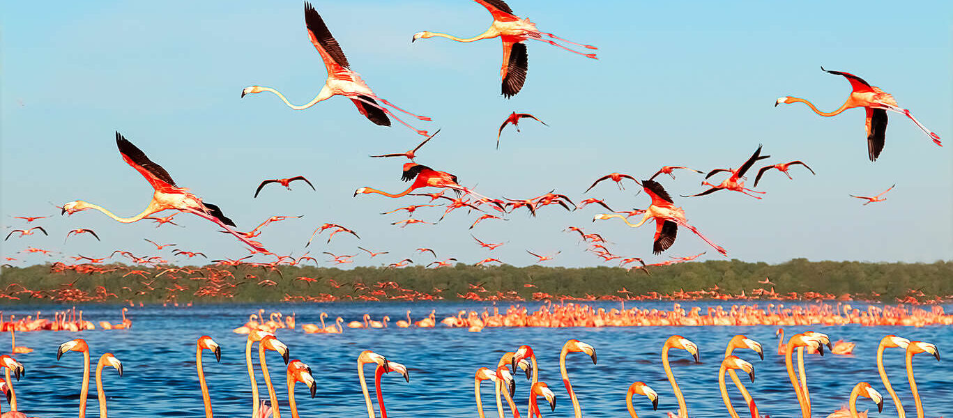 Continuation vers Celestun, petit village de pêcheurs situé sur une langue de terre entre le Rio Esperanza et le Golfe du Mexique. C’est en fait une magnifique réserve ornithologique naturelle où vivent une multitude de flamants roses. Promenade en barque pour remonter le fleuve jusqu’à la lagune où se regroupent les oiseaux. Nous vous conseillons de déjeuner dans un des nombreux restaurants situés sur la plage (poissons et crevettes). Retour sur Mérida. Dîner libre et nuit à l’hôtel.