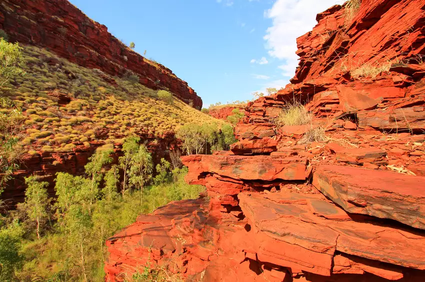 Départ pour le Parc National de Karijini, connu pour ses piscines naturelles, ses cascades et ses gorges impressionnantes.