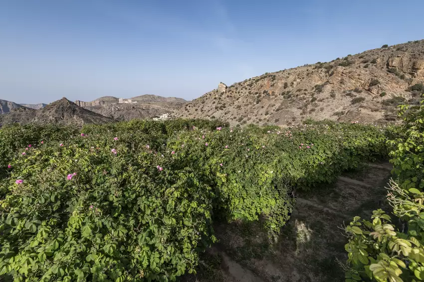 Balade parmi les villages de roses, où la récolte suit le rythme des saisons et parfume la montagne de ses effluves. Visite d’un atelier d’extraction de rose : les familles perpétuent une technique héritée de Perse et adaptée aux roses du Jabal Akhdar.