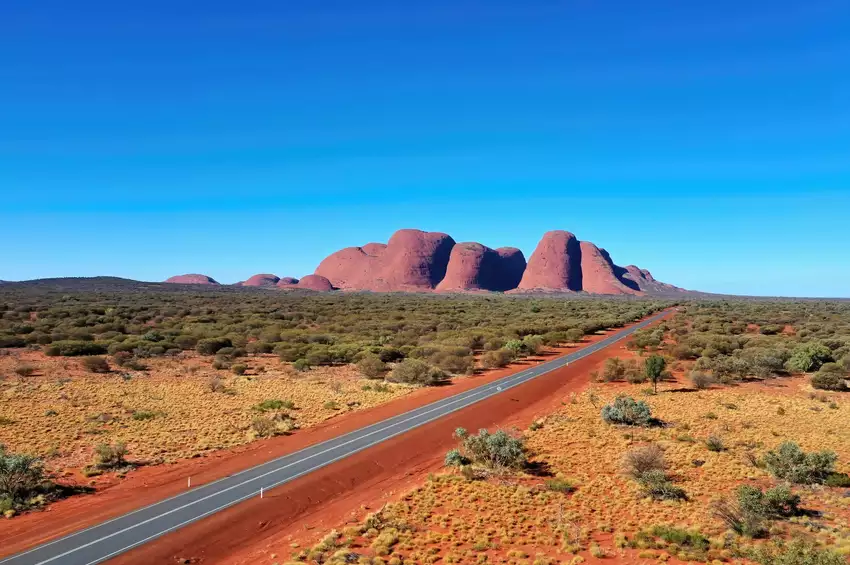 Route pour Kings Canyon, situé dans les George Gill Ranges, entre Alice Springs et Uluru. Le site se caractérise par des falaises de grès de 300 mètres de haut, par des sentiers de randonnées, des crevasses pleines de cycas, de magnifiques gorges et d’époustouflantes vues sur le désert rouge.
