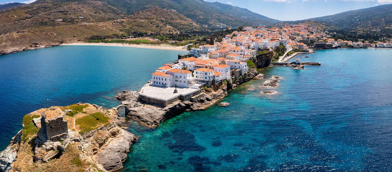 Andros offre un visage différent des Cyclades : montagnes douces, vergers, villages élégants aux maisons néoclassiques, et un littoral secret abritant des plages accessibles seulement par la mer.