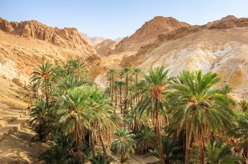 L’après-midi, découverte des cascades verdoyantes de Tamerza et des sources de Chebika, oasis emblématiques de la région. Chaque site révèle un monde secret et rafraîchissant au cœur du désert, où l’eau et la végétation créent des havres de paix. Vous terminerez la journée par une visite du site de Ong Jmel dans le Chott el Gharsa, paysage lunaire et emblématique pour les cinéphiles, qui rappelle des scènes de films tournés dans le désert tunisien. Nuit à Tozeur.