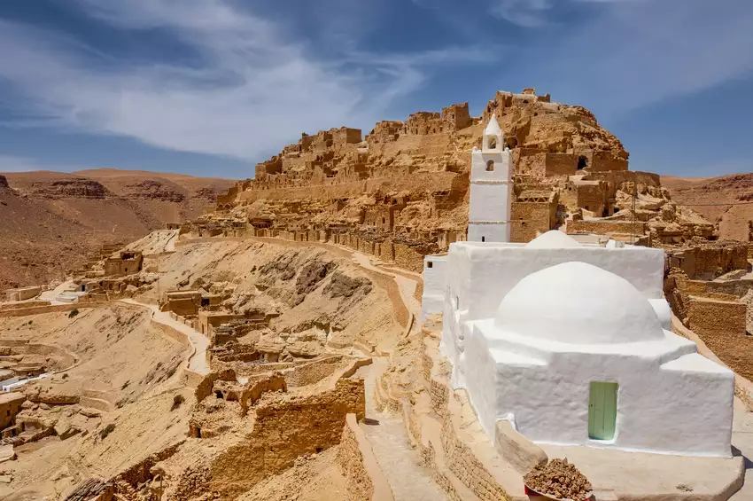 Dans l’après-midi, visite de Chenini, village troglodyte perché sur les collines, où les ruelles escarpées et les maisons creusées dans la roche offrent des panoramas impressionnants sur les plaines environnantes. Ensuite, route vers Djerba, île aux plages méditerranéennes, marchés colorés et villages pittoresques. La douceur de vivre et la lumière unique de l’île annoncent une immersion dans l’atmosphère chaleureuse du sud tunisien. Nuit à Djerba.