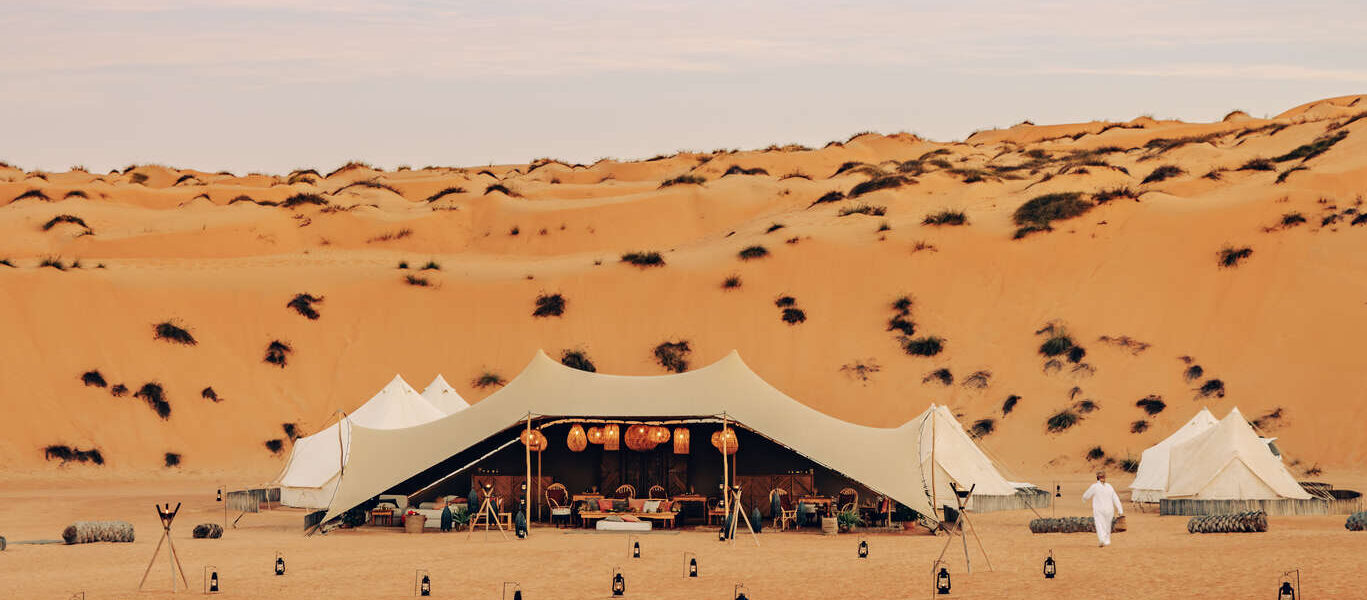 Installation dans un campement intimiste et élégant, parfaitement intégré au désert. Tentes spacieuses, matières naturelles, lanternes suspendues, grands tapis et espaces communs chaleureux. À la tombée du jour, le camp s’illumine doucement, tandis que le soleil embrase les dunes. C’est notre coup de coeur de ce désert !
